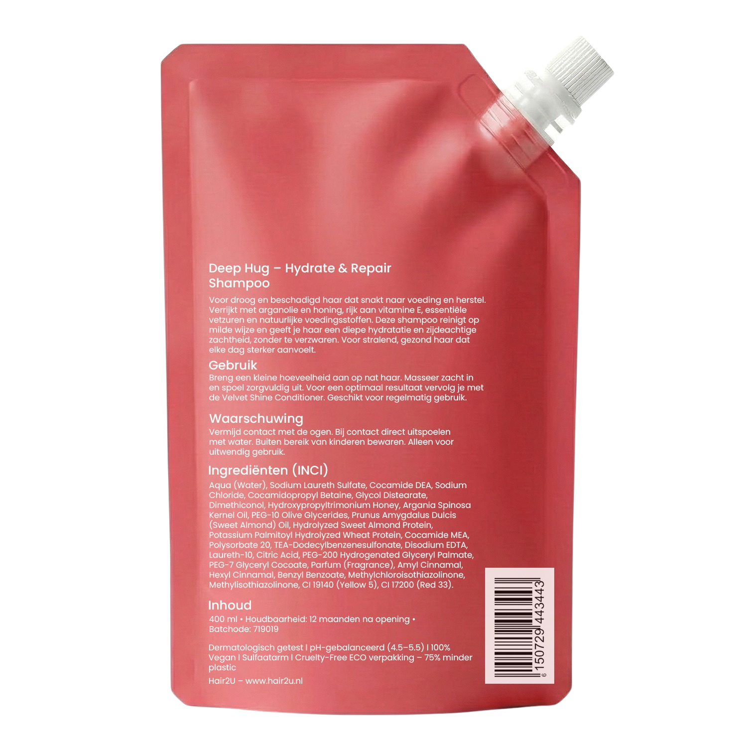 Ja. Deep Hug bevat geen agressieve sulfaten of parabenen die het haar verder kunnen uitdrogen. De milde reiniging respecteert de natuurlijke balans van haar en hoofdhuid, waardoor het haar schoon aanvoelt zonder trekkerig of stroef gevoel.
